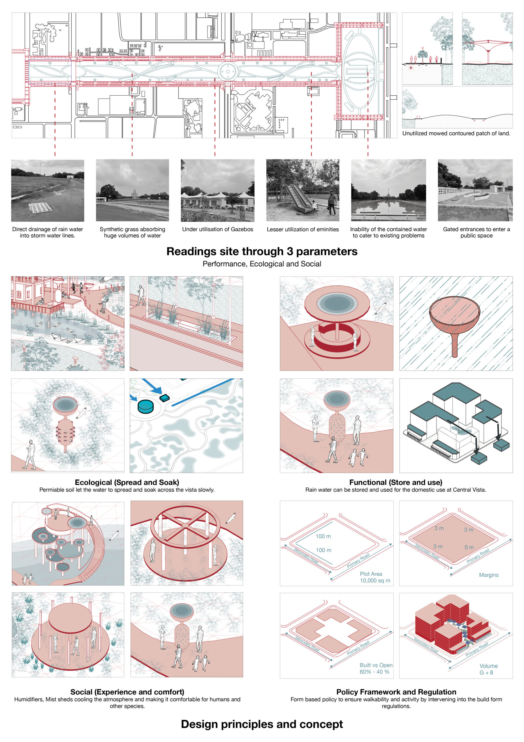 The project redesigns the central vista to a performative water landscape with three core strategies: storing, soaking, and building shared experiences around water systems.